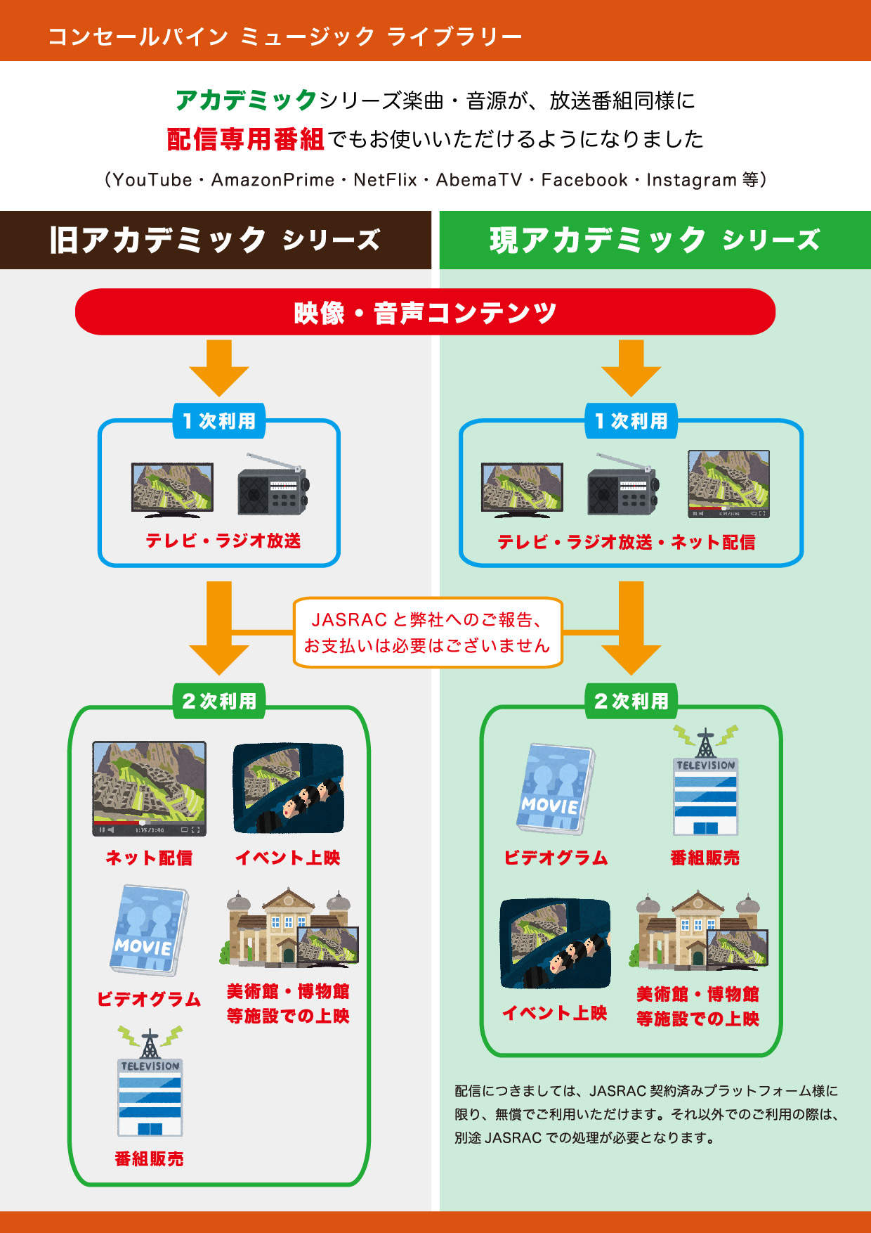 テレビ番組や動画を他メディアへ展開する際、通常はJASRACへの報告や著作権使用料の 払いが必要となりますが、当ライブラリーの音源は、原則として追加費用なしでそのままご利用いただけます。