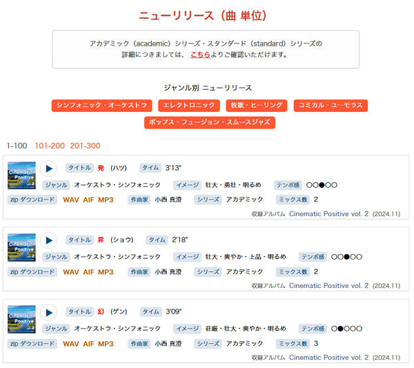 「ニューリリース(曲)」ページと同様に、各音源シリーズの全曲をまとめて試聴・ダウンロードできる一覧ページ をご利用いただけるようになりました。
