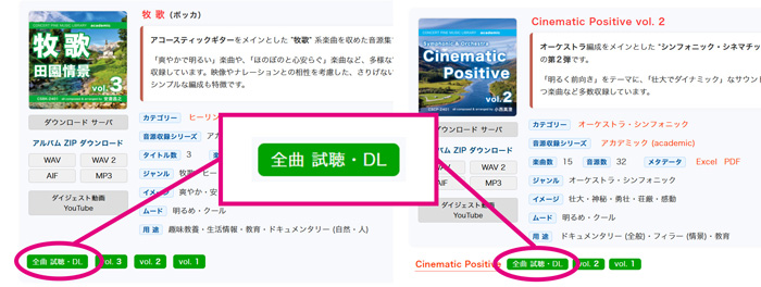 音源シリーズの紹介ページやアルバム詳細ページに設置されている 「全曲 試聴・DL」ボタン から、該当シリーズの一覧ページへ直接アクセスできます。